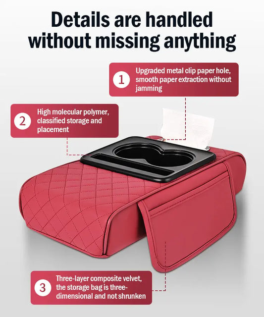 Almofada de apoio de braço para automóvel em pele universal 4 em 1 ✅ Caixa de lenços embutida ✅ Suporte para copos