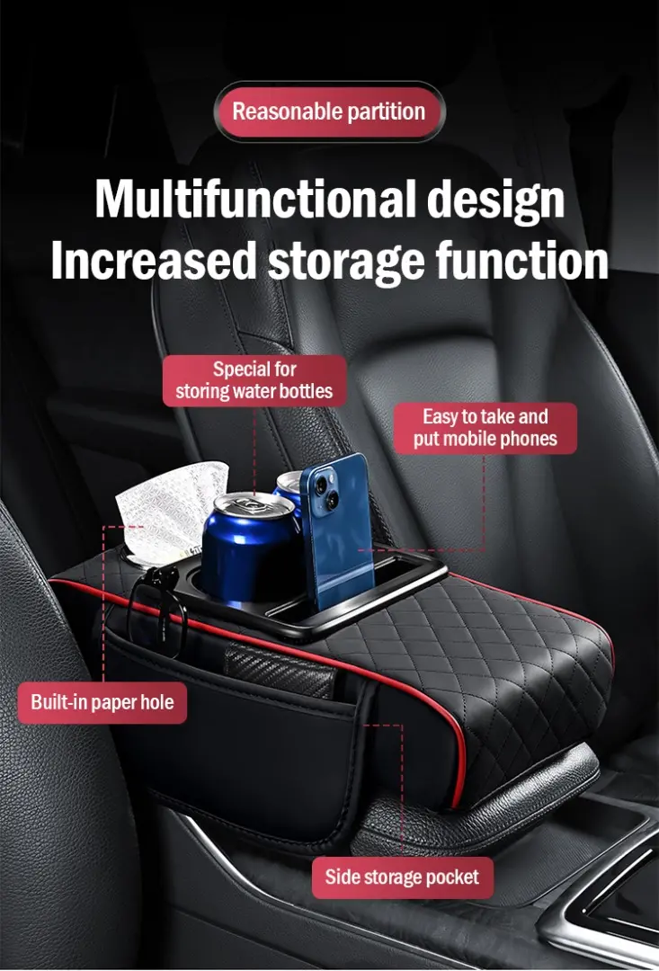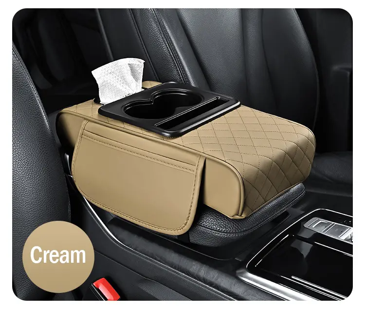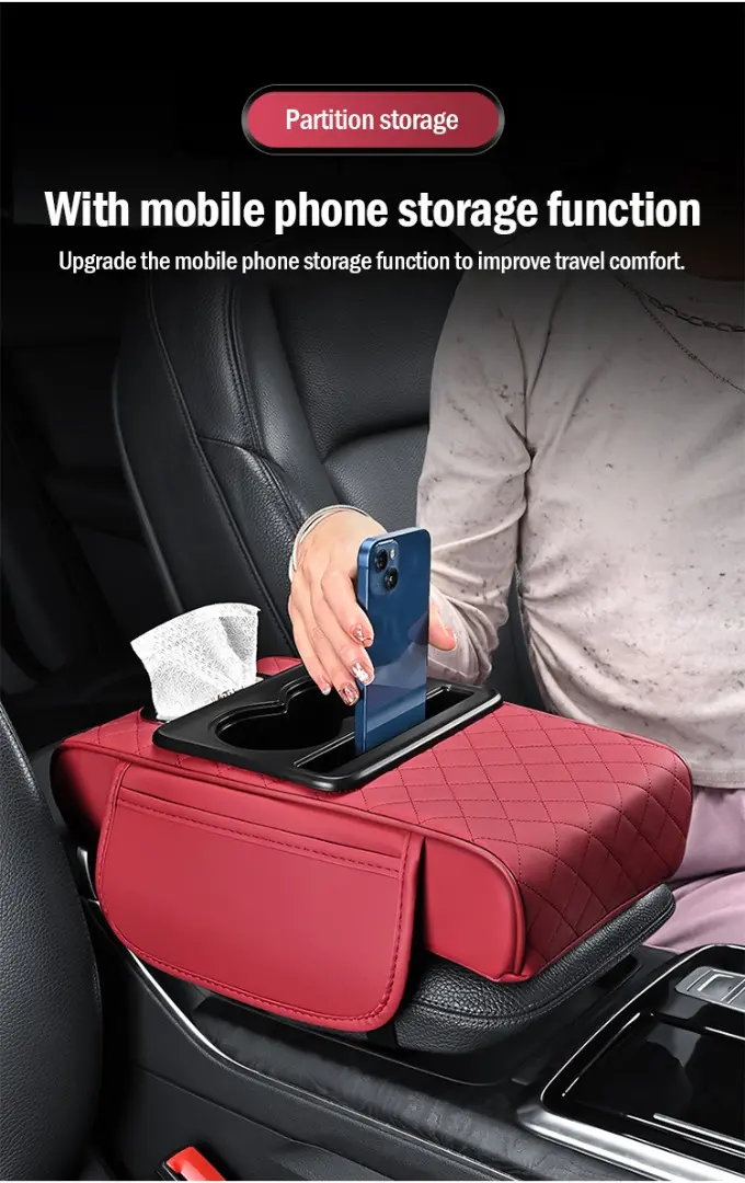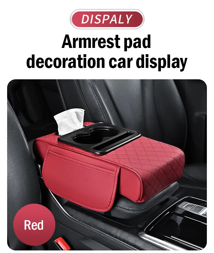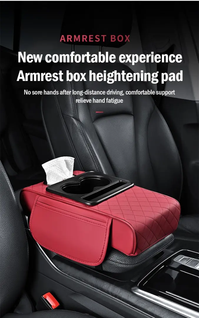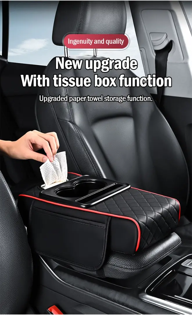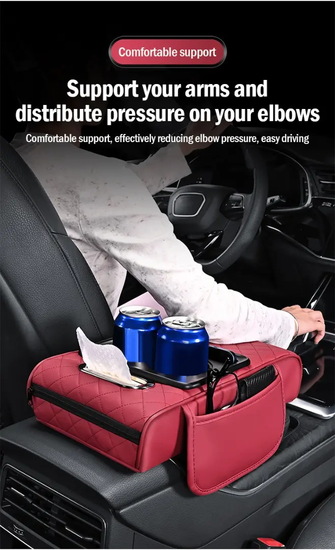 Almofada de apoio de braço para automóvel em pele universal 4 em 1 ✅ Caixa de lenços embutida ✅ Suporte para copos