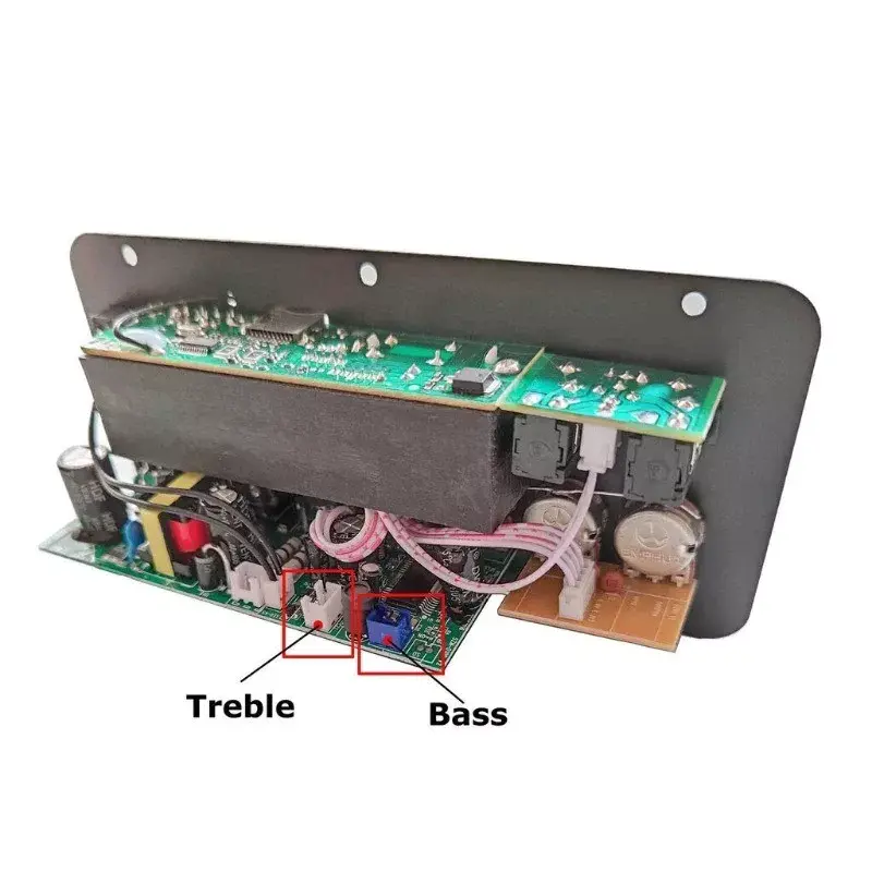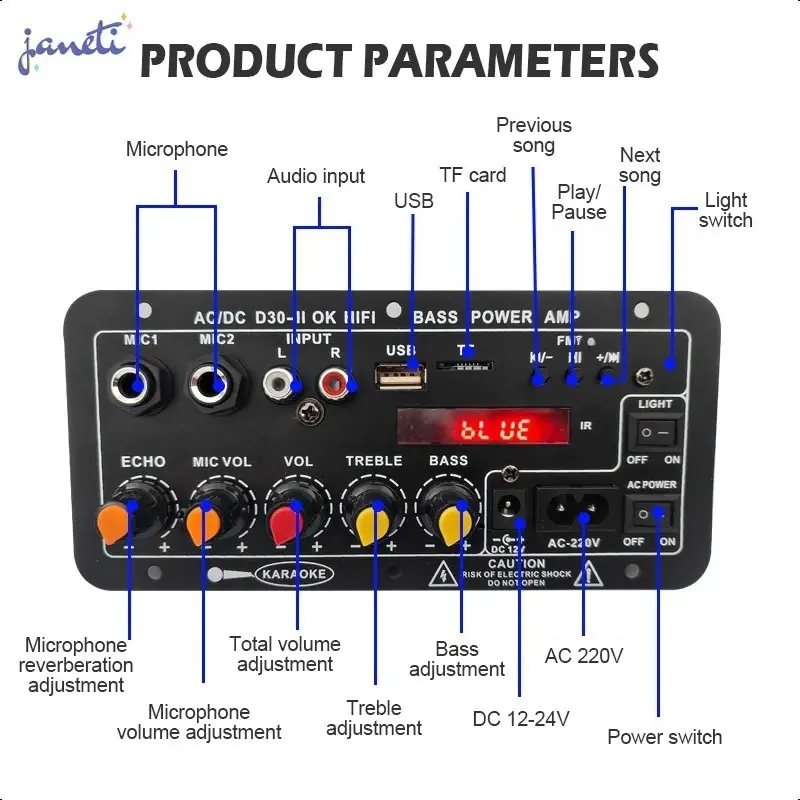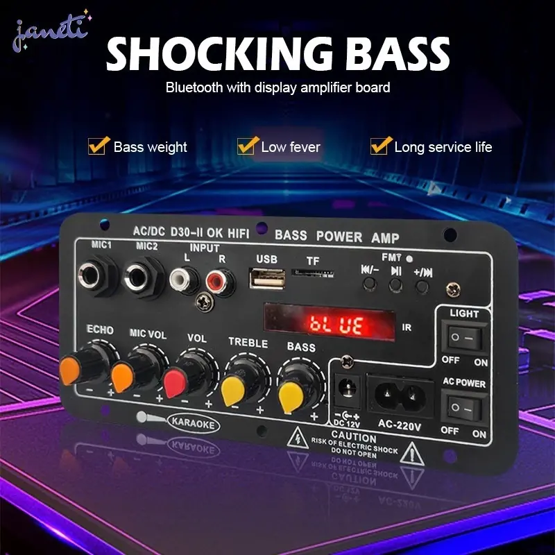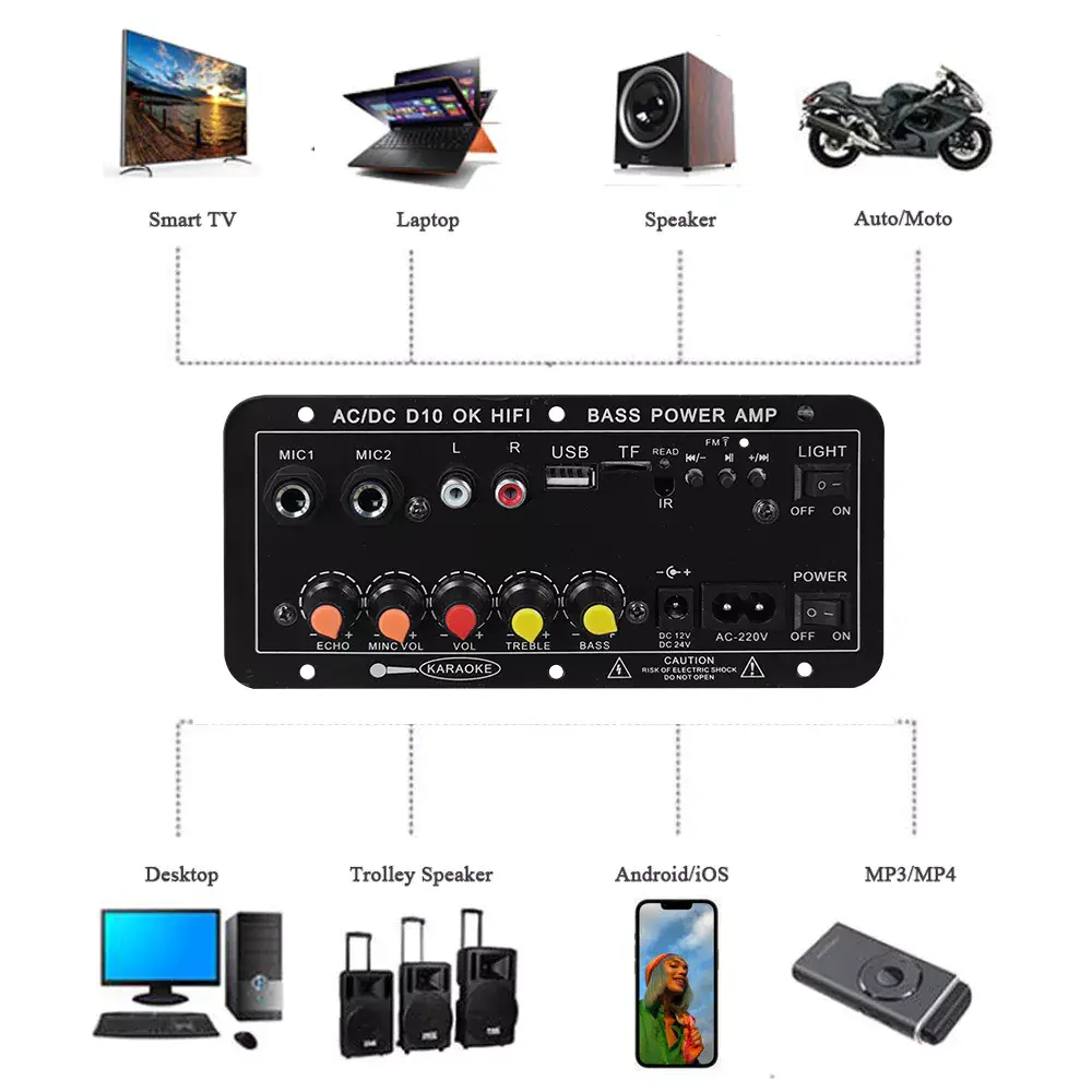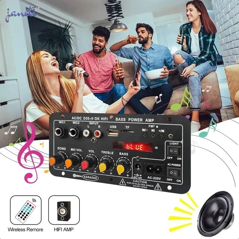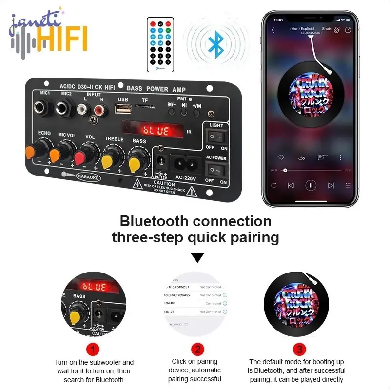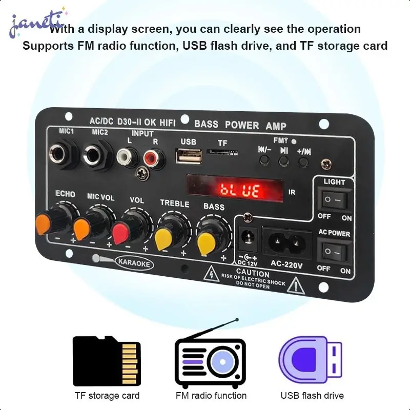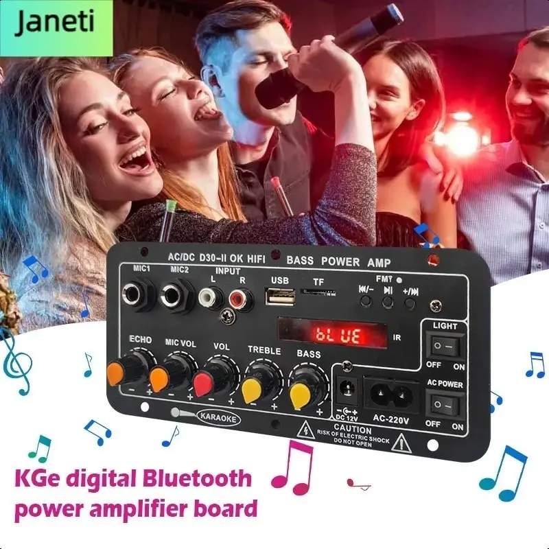 Placa amplificadora DSP Bluetooth 12V/24V com display e slot TF/USB para sistemas automóveis.